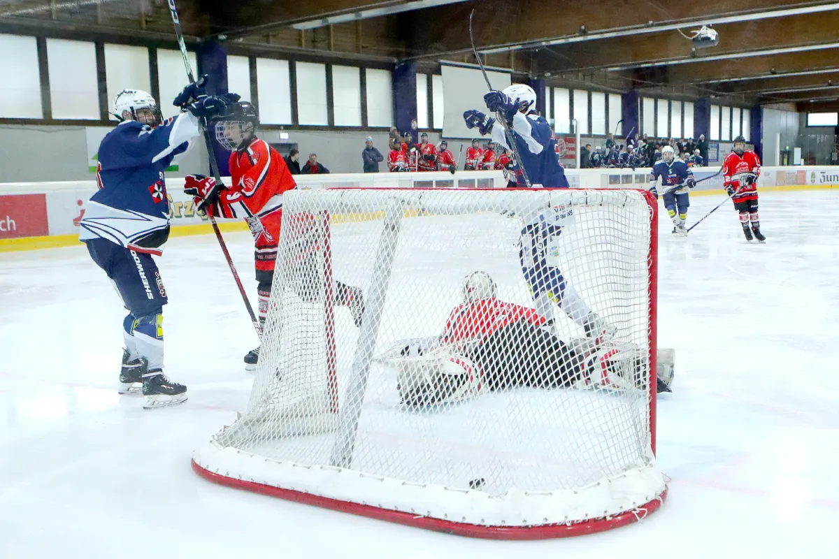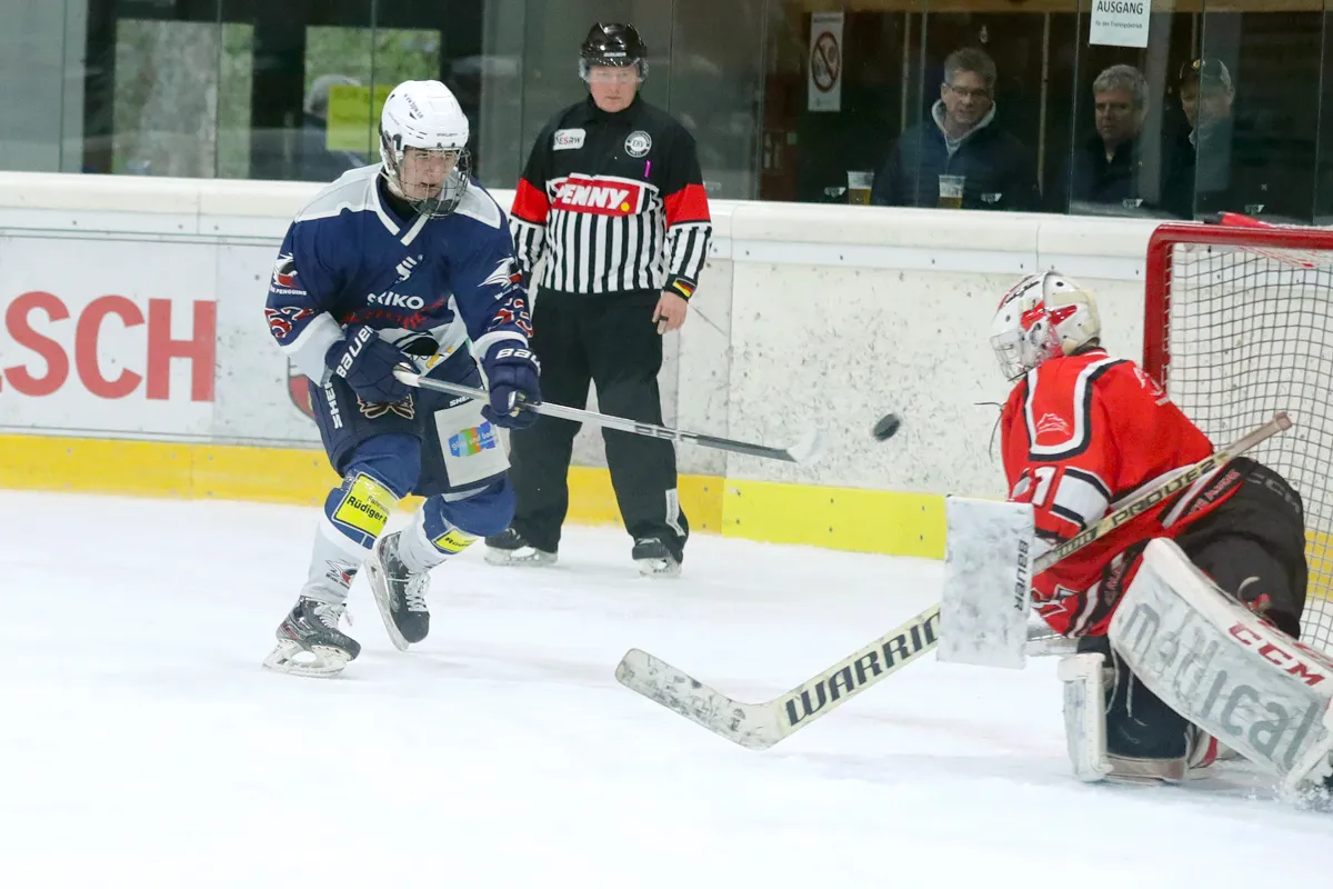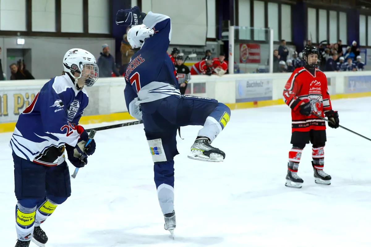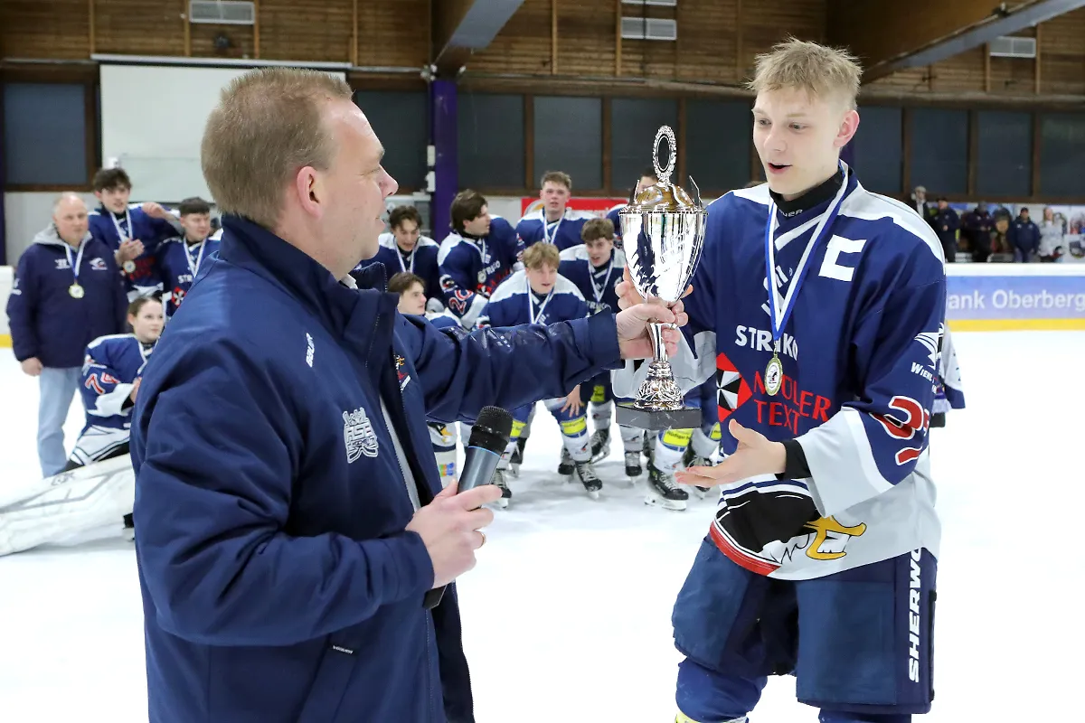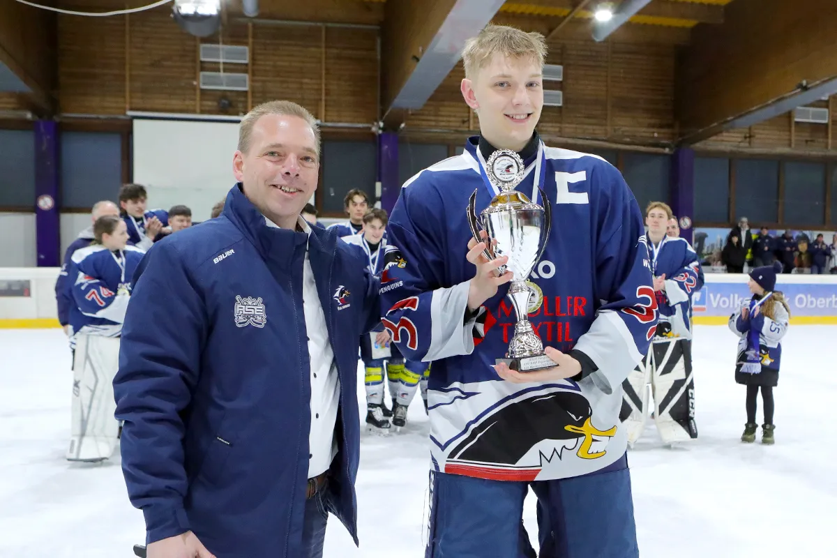 Im letzten Saisonspiel war alles angerichtet, die Penguins hatten nach einer 8 Spiele Siegesserie den Gewinn der Meisterschaft wieder in der eigenen Hand, ein Sieg gegen den Tabellen 5. aus Ratingen musste her. Kein leichter Gegner, hatten die Ratinger doch ihrerseits dem zwischenzeitlichen Tabellenführer aus Herford wichtige Punkte im Kampf um den Titel abgenommen. Die Penguins agierten sofort gewohnt druckvoll im Offensivspiel, mit unbedingter Entschlossenheit den Titel zu holen, von Nervosität keine Spur. Die Defensive war wenig gefordert und agierte souverän bei Ratinger angriffen. Innerhalb von 12 Spielminuten wurde eine 6:0 Führung zum 1. Drittelende herausgespielt. Leonard Kurz traf zweimal zu Beginn, Ben Kautschke mit einem Hattrick und schließlich Mats Göbel. Anstatt das Tempo zu drosseln, wurde auch im zweiten Drittel weiter kombiniert, wenn auch eher „für die Galerie“, um die mehr als 200 (!) Zuschauer zu unterhalten. Mats Göbel und Amand Herczeg stellten auf 8:1 nach dem zweiten Drittel. Der Titel war den Penguins nun nicht mehr zu nehmen. Im letzten Drittel verwalteten die Penguins nur noch das Ergebnis. Felix Flender trug sich noch in die Torschützenliste ein zum 9:3 Endstand für Wiehl. Dank geht auch an die Aliens für die faire Partie und den Gratulationen nach dem Abpfiff, vorbildliches Verhalten der Ratinger. Mit dem Schlusspfiff stürmten die Wiehler Spieler das Eis, eine Saison mit vielen Höhen und kleineren Tiefen fand ihren Abschluss mit dem „vorläufigen“ Meisterpokal (der die Meisterfeier später nicht ganz unbeschadet überstehen sollte). Wir warten auf den „richtigen“ Pokal vom Eissportverband NRW. Zwei Niederlagen stehen am Ende 11 Siege gegenüber in der Hauptrunde. In der Vorrunde gab es in 6 Spielen nur Siege. Somit endet die Saison 25/26 mit der MEISTERSCHAFT DER U20 WIEHL PENGUINS. Die Penguins stellen in dieser Saison sowohl den punktbesten Spieler der Liga mit Ben Kautschke (68 Punkte aus 20 Spielen), wie auch die beiden punktbesten Verteidiger, Mats Göbel und Amand Herczeg. Mit Leo Kurz (Platz 3) und Vincent Nosber (Platz 10) sind noch zwei weitere Wiehler bei den Stürmern unter den TOP10 der Scorer-Wertung. Bei den Goalies belegten mit ihren starken Leistungen Annalena Hummel Platz 3 und Lars Meurer Platz 6.