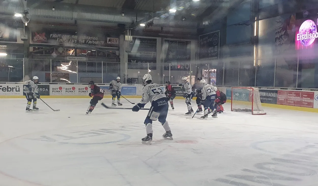 Die Wiehler Serie von Auswärtsspielen endete am Sonntag mit einer Niederlage im Penaltyschießen bei den Troisdorf Dynamites. Die Woche davor konnten die Penguins mit dünnem Kader auch in Herford nichts Zählbares mitnehmen.In Herford traten die Penguins nur mit 2 Reihen an. In einem schnellen und guten Spiel lag man nach dem ersten Drittel mit 3:0 hinten, nach 3 vermeidbaren Gegentoren. Jeweils wurde in der Zone vor dem eigenen Tor der Nachschuss bzw. der Gegenspieler nicht kontrolliert, weil sich die Penguins zu sehr auf den Spieler mit der Scheibe fokussierten.Im 2. Drittel wurden die Fehler abgestellt und ein Sturmlauf der Wiehler begann, mit ein Schussverhältnis von 16:3 nagelte Wiehl die Herforder Dragons in der eigenen Zone fest. Ein sehr stark spielender gegnerischer Torhüter verhinderte jedoch das man näher als 3:2 herankam. Die Tore erzielten Amand Herczeg und Leonard Kurz.In Drittel Nummer 3 nahmen sich die Penguins viel vor, bekamen jedoch bei einem gut gespielten Konter direkt zu Beginn des Drittels das 4:2. Gegen die kompakt und stabil agierenden Dragons war es nun schwer einen weiteren Treffer zu erzielen und die Kräfte ließen doch deutlich nach bei den Penguins. So hieß es am Ende 6:2 durch einen weiteren gut herausgespielten Treffer und ein Empty Net der Dragons.
